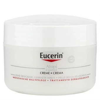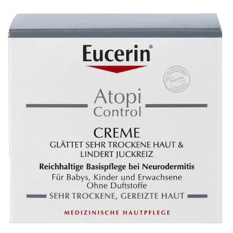 Die reichhaltige Eucerin AtopiControl Creme zur Glättung und Beruhigung atopischer Haut ist besonders für die tägliche Basispflege geeignet. Die Formel mit natürlichen Wirkstoffen regeneriert die Haut durch eine hohe Konzentration an Licochalcone A und Omega-6-Fettsäuren in akuten und symptomfreien Phasen der Neurodermitis. Sie beruhigt die Haut und lindert Juckreiz, Entzündungen und Spannungsgefühle. Nach der Anwendung fühlen sich trockene und gereizte Hautbereiche wie Kniebeugen oder Ellenbogen spürbar weicher und geschmeidiger an. Die parfümfreie Creme weist eine hervorragende Hautverträglichkeit auf und ist für Erwachsene, Kinder und Babys ab 3 Monaten geeignet.