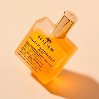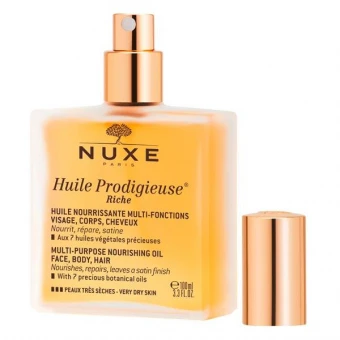 Huile Prodigieuse®, das NUXE Kult-Produkt ist die Nr. 1 der Öle in französischen Apotheken. Das sogenannte Multifunktions-Trockenöl für Gesicht, Körper und Haar nährt, regeneriert und macht geschmeidig. 7 wertvolle Pflanzenöle, darunter Tsubaki- und Arganöl, sorgen für wunderbar gepflegte Haut und glänzendes Haar. Das Huile Prodigieuse® Riche ist die reichhaltige Version des Klassikers und optimal auf die Bedürfnisse von trockener und sehr trockener Haut abgestimmt. Eine erhöhte Konzentration an wertvollem Macadamiaöl sorgt für geschmeidige Haut und ein angenehmes Hautgefühl. Die einzigartige Textur zieht sofort ein und der wohltuende Duft sorgt für einen echten Verwöhnmoment.
